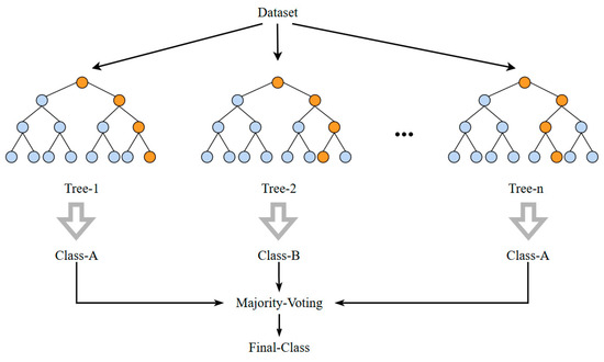 RF is a common and widely used homogeneous ensemble learning algorithm. Based on the idea of bagging [22], n training samples are extracted from the training set every time there is a return, a new training set is formed, multiple sub-models are trained, and finally the sub-model with the most votes is selected by a voting method for classification. RF consists of multiple DTs [23]. DT has the advantages of simplicity and strong interpretability and is a supervised learning algorithm. RF reduces the impact of inaccurate classification results caused by outliers in the DT. At the same time, due to the use of partial features from some samples to construct a DT in RF, the possibility of overfitting is reduced. We chose the Gini coefficient as the criterion corresponding to the CART classification tree. The RF model diagram of this experiment is shown in Figure 1.