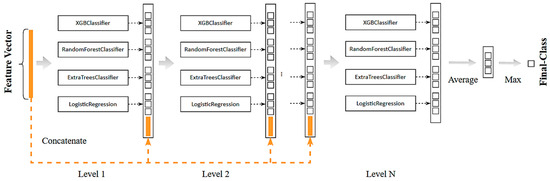 Inspired by deep network learning, the Multi-Grained Cascade Forest (gcForest) algorithm is proposed. The gcForest generates a deep forest with three characteristics: layer-by-layer processing, intramodel feature transformation, and sufficient model complexity. The gcForest model divides training into two stages, Multi-Grained Scanning and Cascade Forest. Multi-Grained Scanning generates features, and Cascade Forest generates prediction results through multiple cascades of forests [24]. The gcForest has fewer parameters than deep neural networks and has considerable robustness to hyperparameter settings. In order to better adapt to the low-dimensional characteristics of credit loan data, we abandoned Multi-Grained Scanning. The structure of the gcForest model used in this experiment is shown in Figure 2. The base learners used by the model are the XGB Classifier, Random Forest Classifier, Extra-Tree Classifier, and logistic regression. Early_stopping_rounds is set to 3. The maximum number of layers is set to 100.