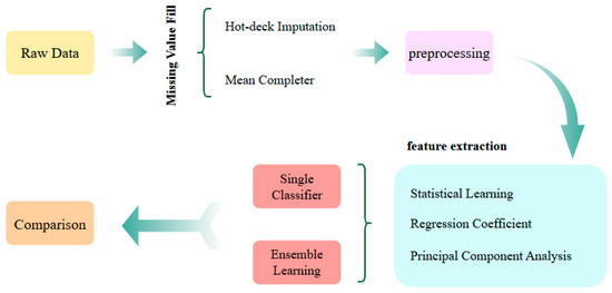 In this paper, the effects of different ensemble learning algorithms on the prediction results of the final model were compared with those of a single classifier model. Different filling methods and feature selection algorithms also have influence on the prediction results. To prevent the loss of some important features, we also compared the impact of the data input models with and without feature selection on the results. The entire default risk prediction model process is shown in Figure 4.