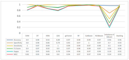 Models such as SVM, DT, KNN, LDA, RF, gcForest, CatBoost, RUSBoost, Imbalance-XGBoost, and Stacking are mainly used in the experiment. The results of the different filling methods, whether feature selection, different feature selection methods, and different models, on user default prediction are compared, respectively. Table 4 shows the impact of the different filling methods on the predicted results. We found that the result of using Mean imputation is better than that of using Hot-deck imputation, especially when using single classifiers. Then, we compared the effects of the different feature selection methods on the model performance, and the results are shown in Table 5. Using the feature selection method based on the regression algorithm, the overall effect of the model is best. In a single classifier, the feature selection using the Elastic Net regression coefficient and input DT model have the highest accuracy, which is 98.59%. The second best single classifier model is 97.18%, and its feature selection algorithm is based on the stepwise regression of the BIC criterion. The regression coefficient can well display the relative contribution of features in the model, so features with little or no contribution can be deleted. Table 5 also shows the influence of the different feature selection methods on the results in ensemble learning. The models with better prediction results are RF and CatBoost. The results of the stepwise feature selection based on the AIC criterion were input into the RF model with the best prediction accuracy of 100.00%, and the highest accuracy of CatBoost is 98.59%. Figure 5 shows the average of various indicator values inputted into each model after four regression coefficient feature selection algorithms. The DT indicators values are higher than 95.00%. The RF, CatBoost, RUSBoost, and Stacking indicators have high values and are greater than 93.00%. In particular, the values of CatBoost are greater than 97%.