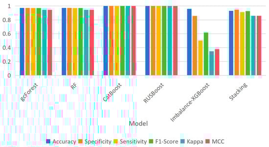 Under Hot-deck imputation, we used the data without feature selection to input each ensemble learning model, and the results are shown in Figure 6, where the index values of CatBoost and RUSBoost reach 100%. We take the optimal results of each ensemble learning model, as shown in Table 6, and the results indicate that Hot-deck imputation is more suitable for ensemble learning model algorithms. Combined with Table 4, the single classifiers are more suitable for Mean imputation.