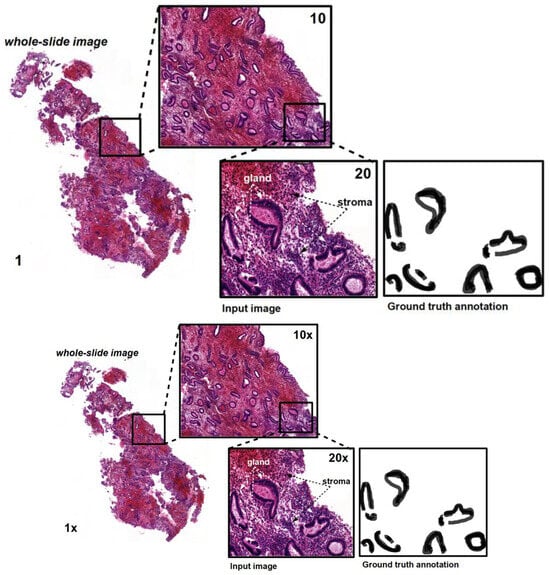 Segmentation models are employed in order to divide the histological images into three different areas, such as endometrial glands, stroma, and other parts of the endometrial sample. The latter one is segmented based on the color, which is usually almost completely white. Areas with endometrial glands are detected using an AI model, and everything that is not glands or background is segmented as stroma. The endometrial glands’ locations are indicated by the dark (grayish) regions (Figure 1 right). A team of pathologists from two countries created ground truth images (annotated photos). At various magnification settings, experts examined and annotated each whole-slide image. The original color whole-slide pictures are the same size as the ground truth segmentation maps. When using a 20× magnification, the size of a gland is typically not greater than 350 pixels. This region is much smaller than the total image—more than 100 times smaller.