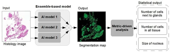 The evaluation of the endometrium tissue is accomplished by estimating the size and density of the nuclei displacement. Firstly, we estimate the density of the nuclei next to the detected endometrium glands and, secondly, in the whole endometrium tissue (see Figure 2). Detection is conducted using an ensemble-based segmentation model that aggregates the outputs of three individual models (more info in Section 4). The resulting output is a segmentation map where the endometrium glands and all other tissues are segmented.