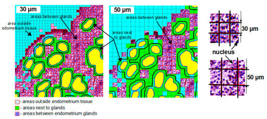 Metric-driven analysis is performed based on a segmentation map, which highlights the positions of the endometrium glands. The nucleus density is calculated using two grids of different densities, such as 30 and 50 µm (see Figure 3). Nuclei in the endometrium image are HE stained; therefore, they appear as blueish areas in the image, therefore, we estimate the size of a nucleus as a detected bluish area in the histologic image.