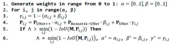 In the following section, the proposed gland detection method is described. The application of deep encoder–decoder CNN architectures of different depths and complexity was inspired by the complex appearance of the target object. The uterus endometrium has glands that highly vary in size, shape, and structure. These glands are tubular in shape and have ciliated columnar epithelium lining them. Due to the estrogen release and depending on the menstrual cycle, the appearance of the glands is changing. In this study, the ensemble-based detection model is investigated and built using segmentation model variants such as U-Net, U-Net++, and Residual U-Net. These models are selected due to their ability to capture intricate features and patterns within medical images, making them suitable for segmentation tasks. When used on various histology images, each segmentation model has a certain level of accuracy that it can achieve. These restrictions may manifest as slices of endometrial biopsies that are not of the same thickness, are not evenly lit, have varied image noise that may obscure key imaging findings or are simply taken at different times of the menstrual cycle. To increase accuracy and produce results that are reliable, all models that were trained on the same dataset are combined into one ensemble. The risk of complex model overfitting is managed through the size of the training dataset and the employment of regularization techniques. To mitigate overfitting, techniques such as dropout, batch normalization, and data augmentation were used. The resulting output, i.e., the predicted segmentation map of endometrial glands, is acquired using a weighted sum of all three individual segmentation maps. The weights are calculated by minimizing the criterion using the pseudo code given in Figure 4. The inverse of the intersection over unit (IoU) value is used as an optimization criterion in our work (1-IoU). The optimization starts from generating α and β values in the range from 0 to 1. The gamma (γ) weight is estimated as the difference between 1 and the sum of the α and β values. The weighted model output or prediction P is calculated in step 4, where PUNet++ is the prediction map given by the UNet++ model, PResnet34-UNet is the prediction map given by the residual model, and PUNet is the predictions of the UNet segmentation model. The intersection over unit value is estimated between manually annotated mask M and weighted prediction P. Optimized weights are estimated when the criterion meets the condition given in step 5. Final weights α*, β*, and γ* are given in step 6. The final prediction map is calculated using the given weights: α = 0.346, β = 0.250, and γ = 0.404.