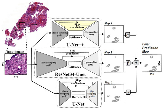 Figure 5 displays the proposed ensemble’s functional diagram. The ensemble comprises the three deep neural network models ResNet34-UNet, UNet, and UNet++. The segmentation model processes the input image, and as a result, an output segmented image of the same as the input size is produced [25], called a segmentation map. The deep neural network encodes input data (color image) through the down-sampling path, decodes a segmentation map through the up-sampling path, and skips connections. A max-pooling layer and a sequence of convolutional layers with decreased size are used to build the down-sampling route. The down-sampling route effectively reduces the high-resolution image to low-resolution. The contextual information is extracted in the left part of the network (down-sampling path), and the spatial information is reconstructed in the right part of the network (up-sampling path). The output map, or segmentation map of the endometrial glands, is produced using the U-Net network’s up-sampling route and is the same size as the input picture. A high-resolution picture was created in the up-sampling step by decoding the low-resolution image (or features). The color images of size 576 × 576 pixels are used as inputs. The size of the input images is gradually reduced; depth is gradually increased until the size of the features reaches 18 × 18 × 512 pixels. The middle convolutional layer is used as a bottleneck, and it is positioned between the encoder and decoder paths. The “bottleneck” consists of convolutional and batch-normalization layers. Through the concatenation of feature maps from the down-sampling side to the up-sampling side, skip connections are employed to transmit local features. The final output layer consists of a convolutional layer with a softmax activation function and a convolutional filter size of 1 × 1. The resulting output segmentation map consists of grayish blobs on a white background, which correspond to the area of the endometrial glands in a colored, HE-stained histology image. Adam optimizer and binary cross-entropy (BCE) loss function were used to train a U-Net network with 7.7 trainable parameters.