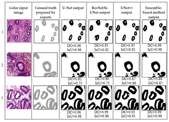 The average IoU was 0.90 according to the ensemble-based technique. Among the three segmentation networks, this result is the best. When all three separate models are unable to reliably identify the endometrial glands from surrounding tissues, the IoU value of the ensemble-based model plummets dramatically. A Dice score of 0.95 on average was shown by the ensemble-based model. Comparing the ensemble-based approach to the other three deep neural networks, the given Dice score of the ensemble-based technique is the best (Table 3). When none of the three models successfully separate endometrial glands from their surroundings, such as other tissues, the Dice score of the ensemble-based technique suffers significantly. Table 3’s bolded text highlights the examined approaches’ best segmentation performance. The suggested ensemble-based strategy produced the best segmentation results, with IoU and Dice scores of 0.90 and 0.95, respectively. On the customized dataset, the U-Net deep neural network had the lowest accuracy, with IoU = 0.77 and Dice = 0.85 as a result.
