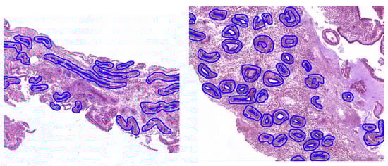 Figure 7 shows the detected positions of endometrial glands on whole-slide images obtained using the ensemble-based technique (the histology image is zoomed in for clarity). Above a colored, HE-stained histology picture, blue contour color patches indicate the probable sites of the endometrial glands.