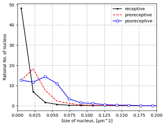 The size, density of the nucleus, and histograms of these measurements in the endometrial sample were chosen as objective metrics, which can be applied for the receptivity assessment. The size of the nucleus in the stroma tissue is equal to the blueish area of the HE-stained image. Squared pixel values are translated to squared micro-meters. Our investigation has shown that the stromal cell nucleus in the endometrial sample is of a size ranging from 0.005 to 0.68 µm2 in the post-receptive stage. The nucleus size from the pre-receptive stage varies from 0.005–0.90 µm2, and in the receptive stage, from 0.005–0.67 µm2. The histogram of the nucleus size is shown in Figure 8, where the rational number of nuclei is given on the vertical axis, and the size of the nucleus is set aside on the horizontal axis. The black color curve represents the receptive stage, the red dashed line represents the pre-receptive values, and the post-receptive stage values are presented with the blue curve. The histogram suggests that the nucleus is bigger in the post-receptive stage when they are compared with the nuclei from other stages.