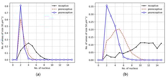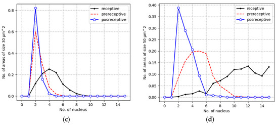 Figure 9 represents the rational histograms of the stromal cell’s nucleus derived using (a) a 30 µm grid, (c) a 50 µm grid, (b) at the 30 µm range from endometrial glands, and (d) at the 50 µm range from endometrial glands. The number of grid cells is given on the vertical axis, and the number of stromal nuclei is shown on the horizontal axis. The histograms show that the highest nucleus density is higher in the receptive samples. Moreover, more nuclei can be detected next to the endometrial glands (these being the nuclei of stromal cells): for instance, on average, up to 12 nuclei can be detected next to the glands and, on average, 4 in all tissue areas.