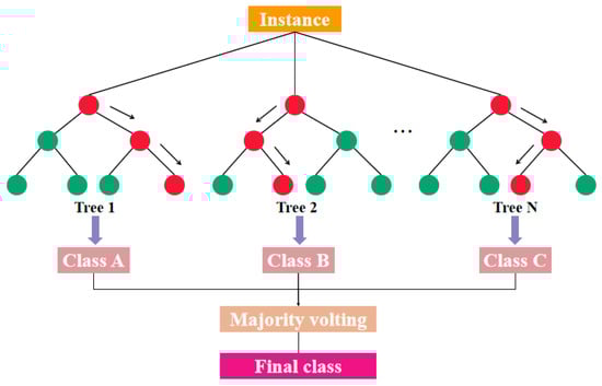 Random Forest (RF) is an integrated learning algorithm; this algorithm predicts by constructing multiple decision trees and combining them together (Figure 1) and therefore effectively avoids the shortcomings of a single decision tree that is prone to overfitting [33]. The following is the detailed algorithmic flow of the Random Forest algorithm: