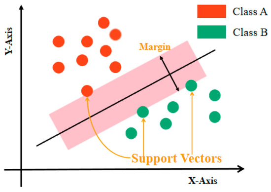 The Support Vector Machine (SVM) model is commonly used as an efficient supervised learning model to deal with linearly differentiable and nonlinear problems [34]. It transforms the initial data to a higher space by means of kernel function mapping, the structure of which is shown in Figure 2. Its kernel function expression is as follows: