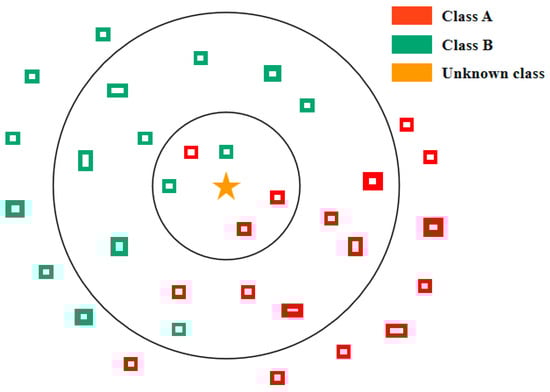 The KNN algorithm is a simple and powerful classification algorithm; for the samples to be classified, it searches its pattern space [35] and finds the nearest K training samples as its K-nearest neighbours according to the proximity of the samples and finally predicts the type of the samples to be classified according to the K-nearest neighbours by using some kind of voting strategy, and its structure is shown in Figure 3. The mathematical expressions of its distance metric and classification prediction method are shown in Equations (6) and (7), respectively: