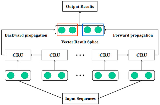 BiGRU is an improved model based on GRU, which consists of a pair of forward-backward GRUs, where both GRUs simultaneously learn feature mapping from the forward and reverse directions [38] and extract the sequence features, and then, the two output vectors from the forward and backward GRUs are concatenated to yield the final result. Since the model is able to capture the information from forward and backward directions, it is able to better understand the features and structures in the sequence and thus has higher model efficiency, and the related principle is shown in Figure 4.
