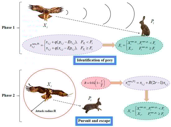 The Northern Goshawk Algorithm (NGO) is a population-based optimisation algorithm with the advantages of strong global search capability, fast convergence, good robustness and flexibility. The NGO algorithm simulates the behaviour of the Northern Goshawk throughout the process of the hunting process, including prey recognition and attack, chase and escape [40], and establishes mathematical models based on the different phases of the hunt, as shown in Figure 5.