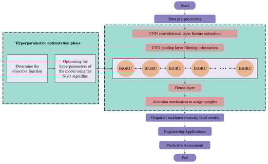 This approach leverages CNN’s feature extraction capabilities, BiGRU’s proficiency in time series modelling and the Attention mechanism’s ability to weigh important features with the aim of enhancing accuracy and robustness in rockburst intensity prediction. The Northern Goshawk Optimization Algorithm is employed for optimising hyperparameters (such as the size of CNN’s convolutional kernel, number of GRU units and learning rate), as well as weight initialisation. With its strong global search capabilities and adaptability to complex prediction scenarios related to rockbursts, this optimisation algorithm effectively improves the classification prediction results’ accuracy and reliability. The model structure is shown in Figure 6: