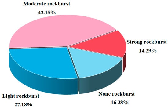 Rockburst [1] is a dynamic instability phenomenon in which the surrounding rock is spalled, blocked, ejected or thrown due to the abrupt and severe dissipation of elastic strain energy in the rock, and its essence is the surrounding rock has gained kinetic energy [2]. As a kind of sudden, random and highly hazardous geological disaster [3], the process of rockburst activity usually has three phases [4], which are the inactive phase, the active phase and the destructive phase. During the inactive phase, the elastic stress energy accumulation is small; in the destruction stage, large-scale rockbursts usually occur; and the active stage is between the inactive stage and the destruction stage of the state, usually accompanied by medium and small-scale rockbursts. In recent years, the frequency and severity of rockbursts have increased with the increase in geological activities due to the increase in underground space engineering activities, as well as the deep mining of mines. Such geological hazards not only affect the construction process [5,6] but also cause harm to social production activities, citizens’ lives and property safety. In view of the hazards of rock explosions, how to prevent the occurrence of rock explosion disasters is particularly important, and rock explosion prediction and evaluation is an important prerequisite for the development of prevention and control measures. Therefore, the accurate and reliable prediction of high-intensity rock explosion disasters has become a research hotspot in related fields [7,8].