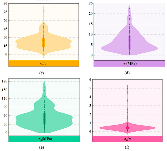 Fiddle map of rockburst data distribution: (a) the maximum tangential stress of the surrounding rock; (b) elasticity and strain energy of the rock index; (c) rock brittleness ratio of rock; (d) tensile strength of rock; (e) the maximum tangential stress; (f) the stress ratio of rock.
