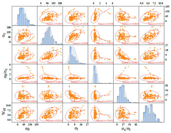 In order to assess the correlation among the six characteristic parameters of rockbursts, a correlation analysis can be based on the Pearson correlation coefficient method [48] for correlation analysis of the above sample data of rockburst prediction; the formula is shown in Equation (25), and the results are shown in Figure 9. The magnitude of the absolute value of the correlation coefficient can be employed to demonstrate the strength of the correlation. The shape of the ellipse indicates the strength of the correlation; the more rounded the ellipse, the weaker the correlation, and the flatter the ellipse, the stronger the correlation.