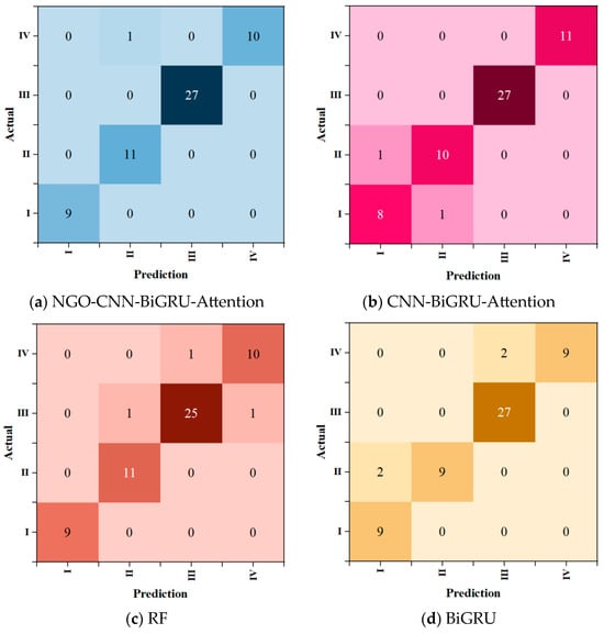 In order to further prove the effectiveness of the NGO-CNN-BiGRU-Attention model, the prediction results of this model were compared with those of other models (see Table 6), and the results showed that the accuracy of the NGO-CNN-BiGRU-Attention model was the highest, thus indicating that the model is an effective rockburst prediction method.