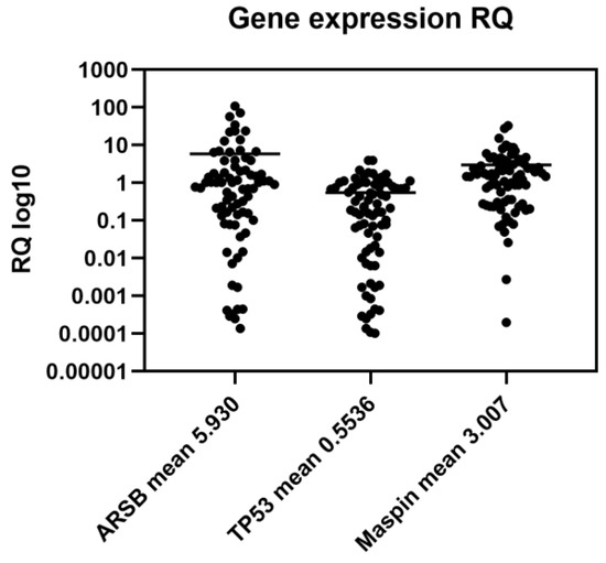Gene expression analyses were carried out on fresh tissue samples harvested during surgical resection from each patient. RNA isolation was performed using Qiagen’s (Germany) RNA extraction kit, adhering strictly to the manufacturer’s protocols to ensure the integrity and quality of the RNA. The concentration and purity of isolated RNA were assessed using a NanoDrop (Thermo Fisher Scientific, Waltham, MA, USA) spectrophotometer, with only high-quality RNA samples proceeding to the next stage of analysis. For the quantification of ARSB, TP53, and Maspin gene expressions, reverse transcription quantitative PCR (RT-qPCR) was conducted using Qiagen’s (Germany) RT-qPCR kit, following the manufacturer’s instructions. This approach allowed for the precise quantification of mRNA levels of the target genes, with GAPDH serving as an internal reference gene to normalize the expression data. The relative expression levels of ARSB, TP53, and Maspin were calculated by employing the 2−ΔΔCt method, which facilitates the comparison of gene expression among the patient samples in a relative manner. For the purposes of this study, gene expression levels were categorized based on their relative quantification (RQ) values: an RQ less than 1 indicated low gene expression, while an RQ greater than 1 signified high gene expression. This binary categorization allowed for a straightforward interpretation of the data, facilitating the subsequent statistical analysis to discern the correlation between gene expression levels and various clinical outcomes (Figure 2).
