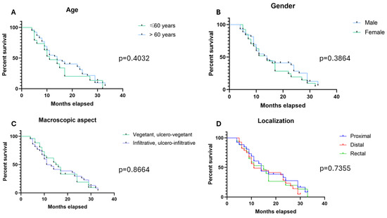 In assessing the impact of various clinicopathological factors on overall survival in CRC, our analysis revealed no significant differences based on age, gender, tumor localization, or macroscopic aspect of the tumors (Figure 3). These findings suggest that, within the cohort studied, these specific demographic and tumor characteristics do not independently influence the survival outcomes of patients. Despite the variability inherent in patient demographics and tumor presentations, these factors did not correlate with significant variations in survival rates, indicating that other molecular or genetic markers may play more critical roles in determining patient prognosis in colorectal cancer.