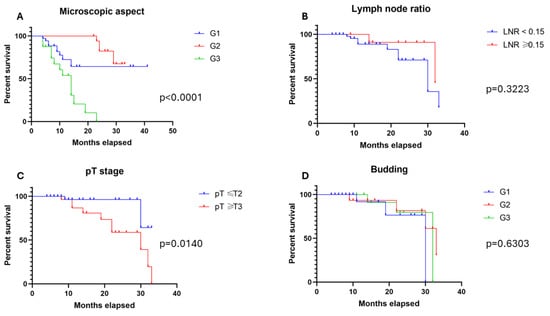 Kaplan–Meier curves highlighting the prognostic significance of microscopic aspect (A) and pT stage (C), with lymph node ratio (B) and budding (D) showing no significant impact.