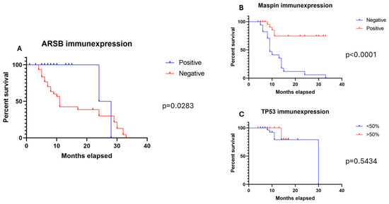 Immunohistochemical analysis of ARSB (A) and Maspin (B) impact on survival: significant prognostic value contrasted with TP53’s (C) non-significant influence.