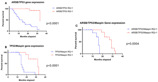 Enhanced survival in linked to dual and triple gene expression elevations: ARSB + TP53 (A) and TP53 + Maspin (B) combinations, and high ARSB, TP53, and Maspin (C) expression synergy.