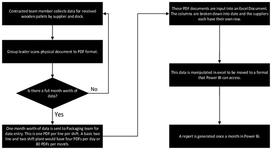 A flow rack being mislabeled or not labeled at all can be a contributing factor in a supplier not getting the correct packaging back to their facilities, which leads to a shortage of usable, returnable packaging. The data that are collected manually will then need to be placed in some sort of database, usually an Excel table, for simplicity. Often, the data will need to be reformatted to allow data visualization to be possible. The data can be shown in Power BI or other similar tools to create a report that can be shared throughout the company without having to have direct access to the underlying data. This underlying data will likely be stored on a shared network drive or through a service such as Microsoft Teams or Microsoft Excel. This process in flowchart form is shown in Figure 1.