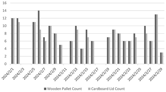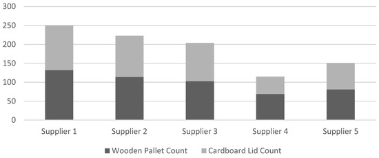 When observing Table 1 and Figure 4, Figure 5 and Figure 6, it is easy to conclude that the simulated manufacturing plant tends to experience similar amounts of expendable cardboard lids as wooden pallets. Figure 4 and Figure 5 can effectively illustrate the condition of wooden pallets and expendable lids received over some time—a month in this instance. Figure 4 would be most useful when evaluating wooden pallets and expendable lid conditions separately, whereas Figure 5 would be more useful when comparing both conditions simultaneously. Figure 6 is a great depiction of both conditions over some time per day. In this format, it would be extremely easy to see how the health of the packaging loop evolves. It is normal to see small amounts of expendable packaging used by suppliers, but a large increase in a short amount of time would indicate a new issue that needs investigation immediately. The ability to react earlier is a huge benefit of having day-by-day data rather than only data from the previous month.