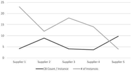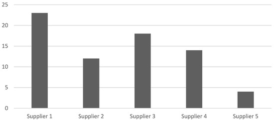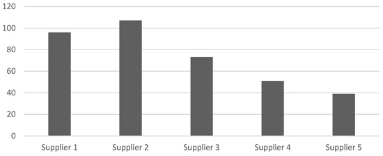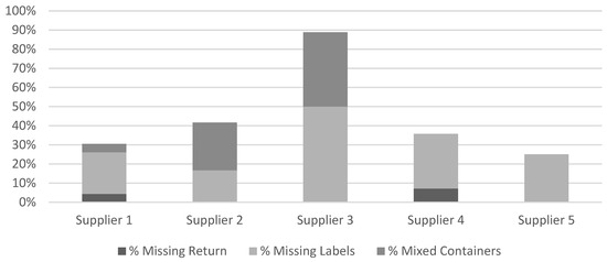 Reviewing the data for the singular cardboard/expendable audit shows insightful data that are helpful to share with suppliers when investigating issues. Table 2 shows the raw data totals, while Table 3 shows percentages based on the number of instances in which cardboard was observed for a supplier. The formula utilized to obtain the cardboard count per instance is simply “cardboard count divided by the number of instances”. A similar formula can be used to understand how long an issue has lasted. By taking the total number of days a supplier has shipped cardboard or wooden pallets and dividing that by the total number of days, it is possible to understand what percentage of days a supplier has shipped poor-condition packaging over some time. These formulas are given as Equations (1)–(5). The missing return column indicates how many instances there are where there is no location for line team members to place containers to return them to the supplier. Missing labels indicate that there is at least one label missing on a flow rack for that supplier. Sometimes, an incorrect label will be considered a missing label. When considering the condition of “mixed containers”, the number of locations in which there are multiple different suppliers in the same return is marked. This condition often causes containers to be routed to the wrong location. Both of these tables are useful in their own way, and these tables indicate that in this scenario, flow racks being poorly labeled does not seem to be an issue. If it were determined that the flow rack condition was a primary cause of high expendable usage, Figure 7 would be a great visualization method for prioritizing suppliers with the highest percentage of this issue.