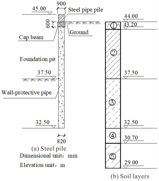 Cross-sectional graph of the supporting structure. (a) Steel pipe; (b) soil layers.