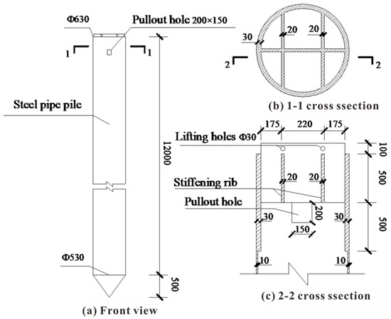 The excavation depth of the test foundation pit is 6.5 m. Considering the field soil textures and site conditions, slopes are reserved at the three sides of the test foundation pit. One site is supported by four recoverable steel-pipe piles, and their length is 12.5 m. To reduce the resistance between recoverable steel-pipe piles and surrounding materials during the steel-pipe pile recovery process, the steel-pipe pile body is designed with a conical shape. Moreover, the top diameter and bottom diameter of the steel-pipe piles are 630 and 530 mm, respectively. The wall thickness of the steel-pipe pile body is 10 mm. Considering the insufficient pile body stiffness during the uplift process, the pile body was thickened (thickness: 30 mm) within the 1 m range of the pipe top and welded with a stiffening rib. For the convenience of hanging, two lifting holes of a diameter of 30 mm are drilled into the stiffening rib. Figure 2 depicts the recoverable steel-pipe pile structure.