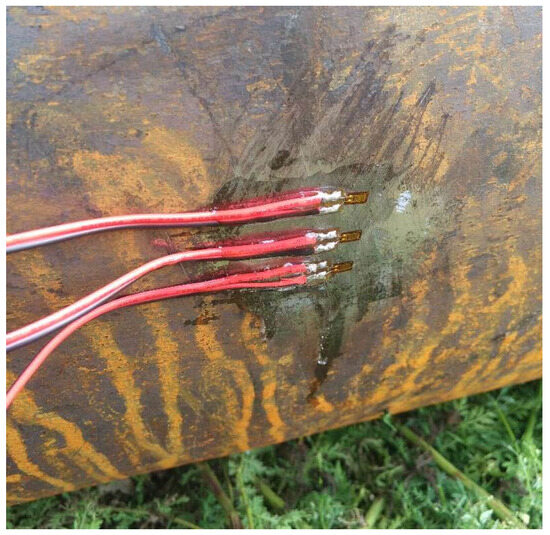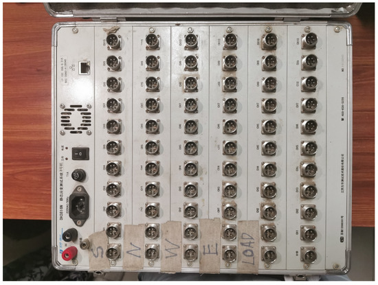 To explore the mechanical performance of the steel-pipe piles during the foundation pit excavation process, 10 strain monitoring points were arranged at the front and rear sides of each steel-pipe pile. A resistance-type strain gauge was pasted on each strain monitoring point. Figure 4 displays the strain gauge. The pile body strain data were collected using a DH3816N static strain testing system, as exhibited in Figure 5. Figure 6 and Figure 7 illustrate the layout of the pile body strain gauge.