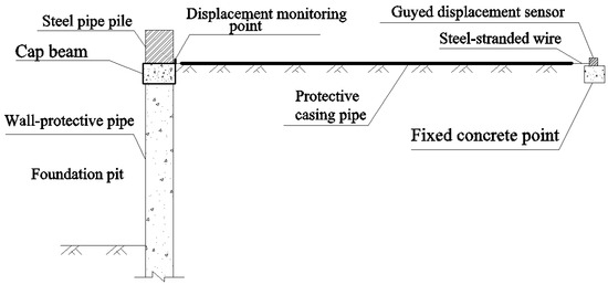 The displacement monitoring point was set at the position behind each steel-pipe pile, with an elevation of 44 m. The guyed displacement sensor was also fastened onto the fixed point beyond the influence area of the foundation pit excavation. In addition, the sensor was connected to the monitoring point of the horizontal displacement of the pile top using a steel-stranded wire. Moreover, the protective casing pipe was used to cover the external side. Figure 10 depicts the elevation of the monitoring points of the horizontal displacement of the pile top.