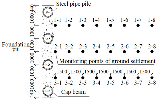 Restricted by the test site conditions, three ground surface settlement monitoring lines were arranged on the ground at the rear side of the supporting structure. Each monitoring line had eight monitoring points. Figure 11 demonstrates the monitoring point layout. The monitoring data of the ground surface settlement at the rear side of the supporting structure were collected using an electronic-level Trimble DiNi03.