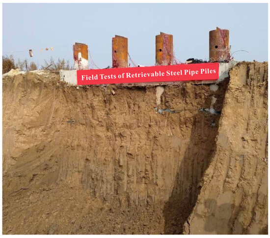 To study the supporting effect and deformation laws of recoverable large-diameter steel-pipe piles during the foundation pit excavation process, a field test was conducted. The test site, which is flat and broad, is located in the northwest of Beijing. From top to bottom, strata soil textures in this site are ① miscellaneous fill, ② clayey silt, ③ sandy silt, ④ sand, and ⑤ silty clay, according to Figure 1b.