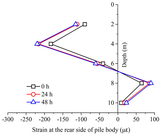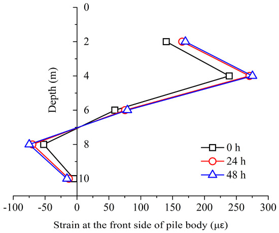 Figure 14 presents that, after the foundation pit excavation, a strain change at the front side of the pile body gradually stabilized with time. The front side of the pile body above the undersurface of the foundation pit was mainly under the tensile state. The maximum tensile strain was 275 με, which occurred at 4 m below the ground surface. At the position below the undersurface of the foundation pit, the front side of the pile body was under the compressive state. The maximum compressive strain was −75 με, which occurred at 1.5 m below the undersurface of the foundation pit. Near the undersurface, zero-strain points appeared at the front side of the pile body. The strain value at the front side of the pile body was greater above the undersurface of the foundation pit than below.