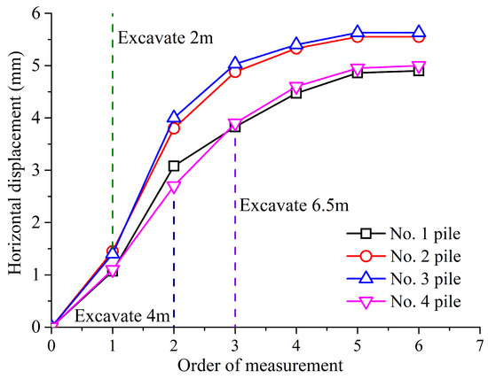 In this figure, the steel-pipe pile top experienced displacement towards the foundation pit during the excavation process. Then, the pile top reached the maximum displacement deformation (at 5.63 mm). The overall deformation was not large and was smaller than the alarm value (50 mm) stipulated in the technical code for the monitoring of building excavation engineering [31]; the supporting effect of steel-pipe piles was favorable. Pile-top displacement deformations were larger in piles No. 2 and 3 than in piles No. 1 and 4 because piles No. 1 and 4 were side piles. Furthermore, the embedding effect of the surrounding unexcavated soil for piles No. 1 and 4 reduced the pile-top displacement toward the foundation pit.
