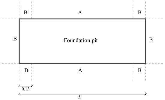 According to the study results of Li [28], the influence area of the soil behind the foundation pit wall was divided as demonstrated in Figure 19, where L is the length of the foundation pit.