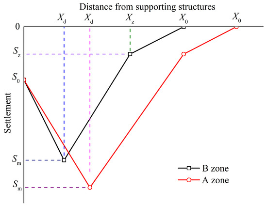 In Figure 20, Xd is the x-coordinate of the maximum settlement point, Xz is the x-coordinate of the turning point of the settlement curve, and X0 is the x-coordinate of the zero-settlement point in the settlement curve; furthermore, Sz is the ground surface settlement value of the turning point of the settlement curve, S0 is the ground surface settlement value near the supporting structure, and Sm is the maximum ground surface settlement value. An analysis showed that the two settlement patterns had similar shapes. The maximum ground surface settlement and boundary of the influence area in the ground surface settlement curve were larger in Area A than in Area B. Both settlement curves presented a “square root” shape, different to the ground surface settlement curve shape caused by the foundation pit excavation under the support of recyclable large-diameter steel-pipe piles.