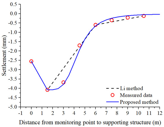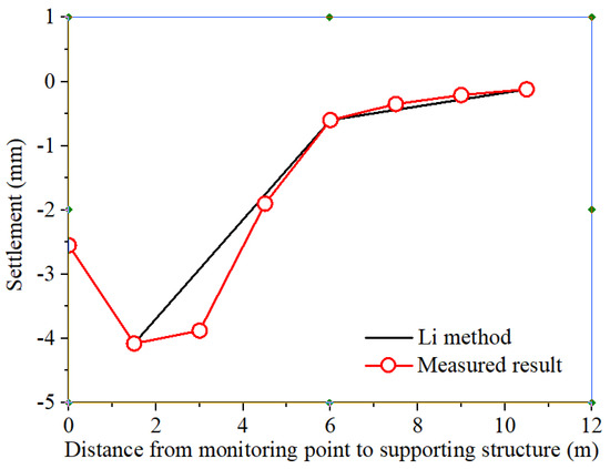 Comparison of the ground surface settlement curve obtained through Li’s method and the measured result.