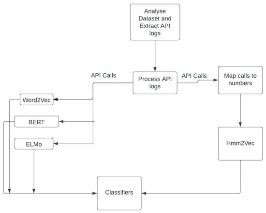 Figure 1 provides an overview of the experimental trajectory, commencing from malware analysis and log extraction, culminating in classification endeavors. The overall procedure remains largely uniform across methodologies, with the exception of HMM2Vec, which encompasses an additional step for mapping calls to numerical values.