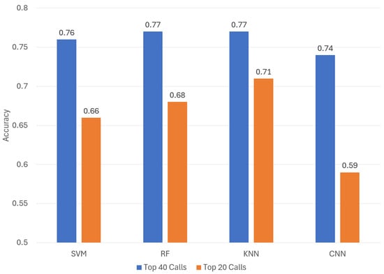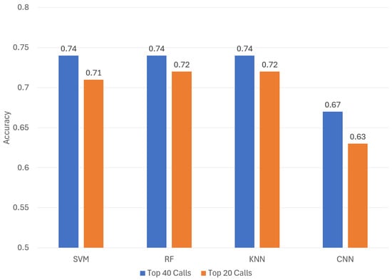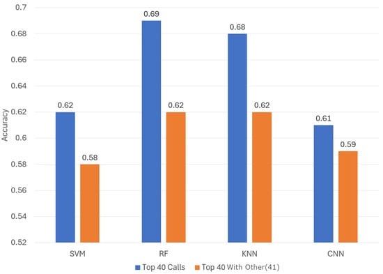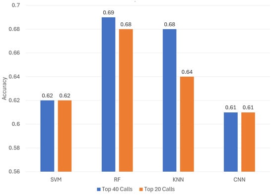 Table 3. Remarkably, even when focusing exclusively on the top 40 calls, we managed to capture over 99% of the entire set of calls. Conducting experiments with the complete API call values did not result in enhanced performance. As a result, we chose to present only the experiments involving these two sets of percentage distributions.