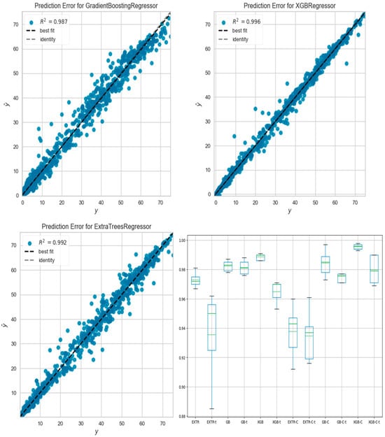 Extreme gradient boosting (XGB) and random forest models for tabulated data are preferred over artificial neural networks (ANNs) [19,20,21]. Three models were selected for fitting the pilot data: XGB, gradient boosting (GB), and the random forest-based Extra Trees regressor (EXTR). The detailed parameter options can be found in [22]. Default parameters were used, with a fixed number of estimators (n-estimator = 100), and the data (5168 × 38 after dropping the desired fitting target) were divided into a 75% sample for training and a 25% sample for testing.