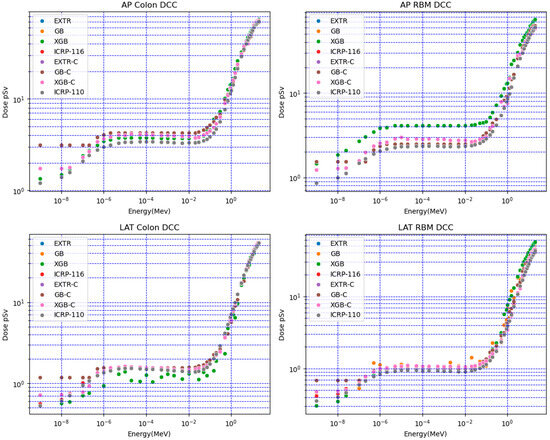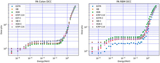Figure 2 shows a comparison of the XGB, GB, and EXTR models. These models used both numerical and categorical data (XGB-C, GB-C, and EXTR-C) to predict doses for the target voxel-based anthropomorphic phantom. Selected organ doses for the colon and red bone marrow (RBM) at different irradiation positions (AP, PA, and LAT) were compared with the ICRP-116 mesh-based and ICRP-110 voxel-based anthropomorphic reference calculated the organ doses. The results obtained when using predictive ML models (numerical and categorical) overlapped with each other; however, a deviation in the results of some models was observed. For red bone marrow (RBM) AP irradiation conditions, the values for neutron energies lower than 1 eV had percentile differences that varied between 40% (for the EXTR, EXTR-C, and XGB-C models) and 87% (for GB, GB-C, and XGB). For higher neutron energies, the values varied between 3% and 27% for all of the models.