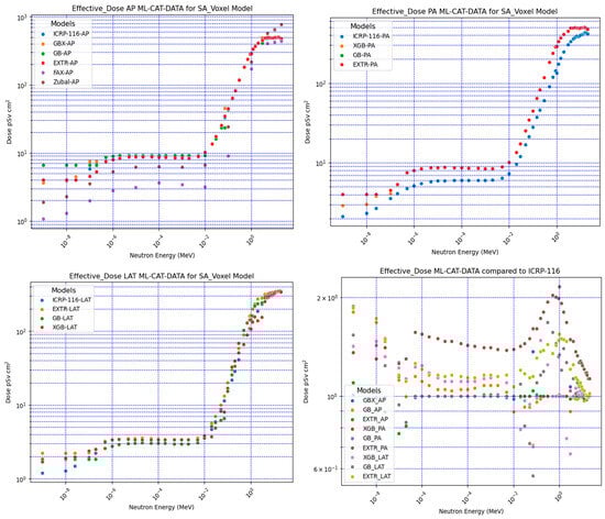 Figure 3 shows the results of the neutron effective dose CC for the AP, PA, and LAT irradiation conditions compared with ICRP-116. The comparison results, obtained through dividing the ML model-predicted value by the ICRP-116 values, are shown in Figure 3 (right lower corner graph). The PA had the largest deviation, which was followed by the AP and LAT. The major contributors to the received dose in organs depend primarily on the position of the organ relative to the irradiation source and the mean position volume of the organ within the phantom. Therefore, differences can be expected when comparing with the agreed reference anthropomorphic phantom provided by the ICRP. Figure 3 shows the PA effective dose calculations for the FAX voxel-based phantom using the ICRP-103 radiation weighting factors [23] and the Zubal voxel-based phantom [24]. The deviation was larger than the Saudi voxel-based ML model-predicted neutron effective dose CC versus the ICRP reference values. The use of different neutron radiation weighting factors and different numbers of organs in the calculations may explain the larger deviation for the FAX voxel phantom and, to a lesser extent, Zubal voxel-based phantoms, compared to that in the current study. Despite the possible sources of variation, the present results indicate that the ML model predictions were within the range of expected differences given the large variations between neutron effective doses from different anthropomorphic phantoms [13,14,15,16,17,23,24].