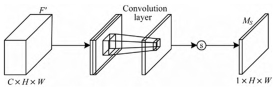 The spatial attention module mainly focuses on the positions of meaningful features, which effectively supplement the information that the channel attention module focuses on. The structure of the spatial attention module is shown in Figure 5. The input of the spatial attention module is the feature obtained by the channel attention module represented by . Similar to the channel attention module, the spatial attention module also performs global average pooling and maximum pooling operations on the input features in the channel dimension, resulting in two 1 × H × W channels. Then, these two channels are concatenated together and compressed through a 7 × 7 convolutional layer. Next, the weight coefficients represented by are obtained through a Sigmoid activation function operation, as shown in Formula (3). Finally, the weight coefficients represented by and the input features represented by are multiplied to obtain the new features processed by the spatial processing module, represented by , as shown in Formula (4). Where represents the sigmoid function and represents a convolution operation with a size of .
