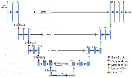 The Unet model is a widely used segmentation network in the field of medical images, which uses multi-scale features for semantic segmentation. Figure 1 shows its basic network structure. It can be seen that the Unet network is based on encoder and decoder structures. The Unet network generates feature maps with low resolution and high-dimensional semantics through convolution and pooling operations during the encoder stage. The decoder stage restores the feature map to its original resolution through continuous convolution and upsampling operations, ultimately obtaining the segmentation result. However, the model ignores local features of key edge information, resulting in lower universality of the network. Therefore, this article improves the feature extraction part of the network by adding residual structures with better feature extraction capabilities and introduces the CBAM attention module to allow the model to focus more on crack details.